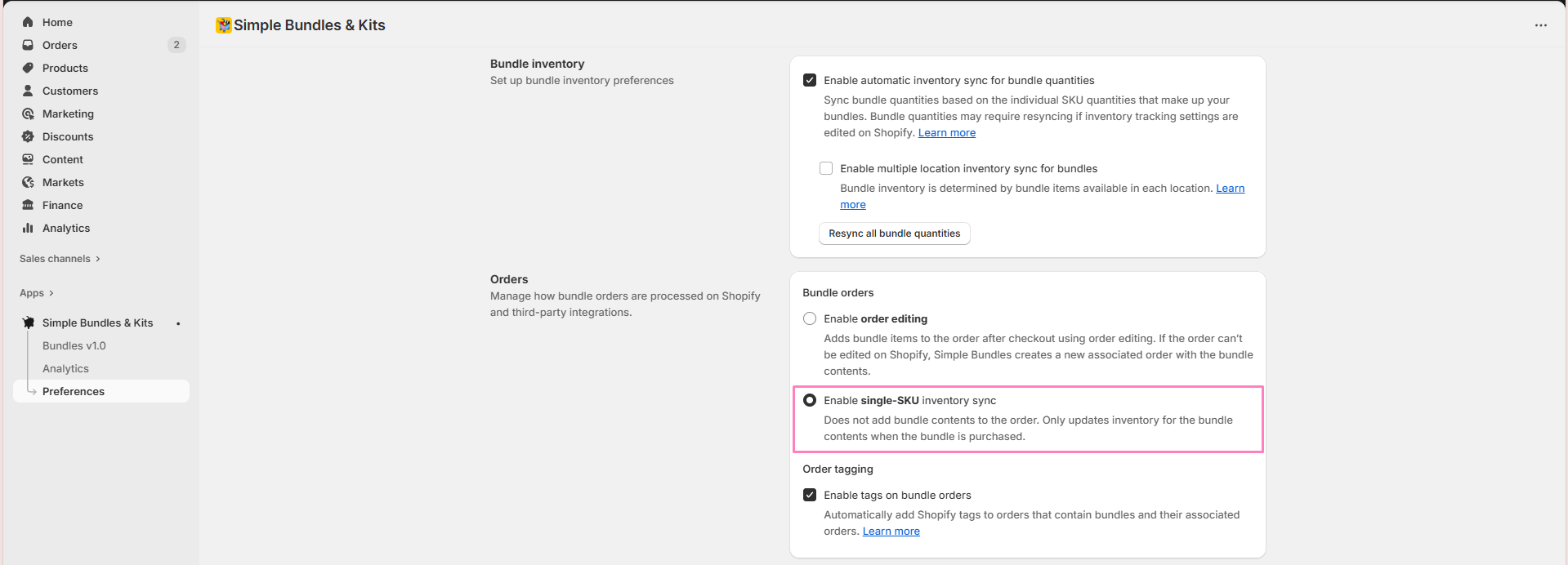 If you would like to disable the multi-SKU breakdown of bundle contents on orders, you can enable single-SKU inventory sync from the Orders section under Preferences.