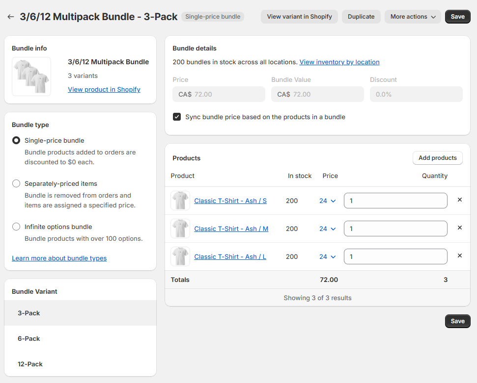 For our example, let's take the 3/6/12 Multipack Bundle with three products added to this bundle: