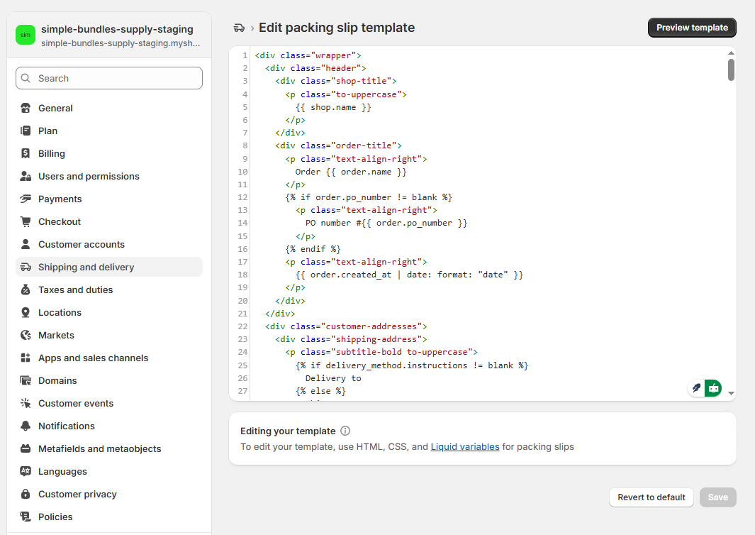 Once the order metafields have been enabled, you can edit your packing slip template in Shopify.