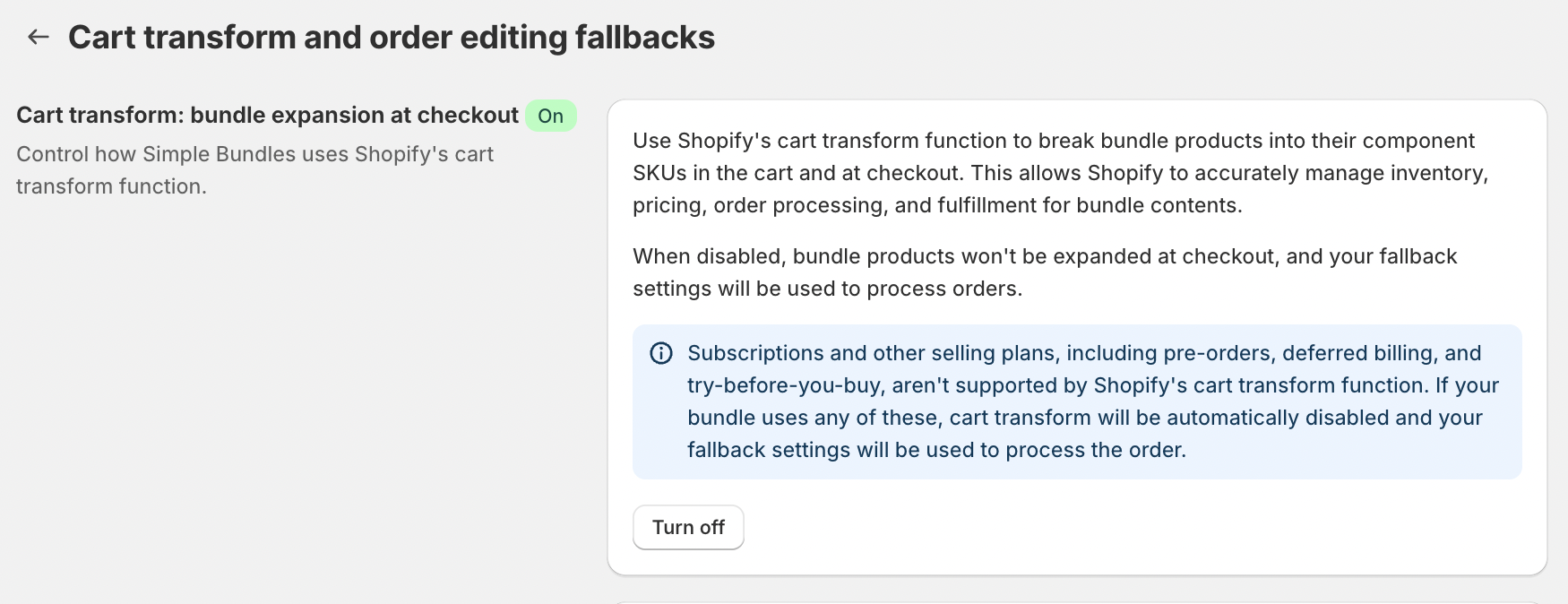 You can manage the Cart Transform setting by navigating to App Settings > Advanced Settings > Cart Transform and Order Editing Fallbacks.