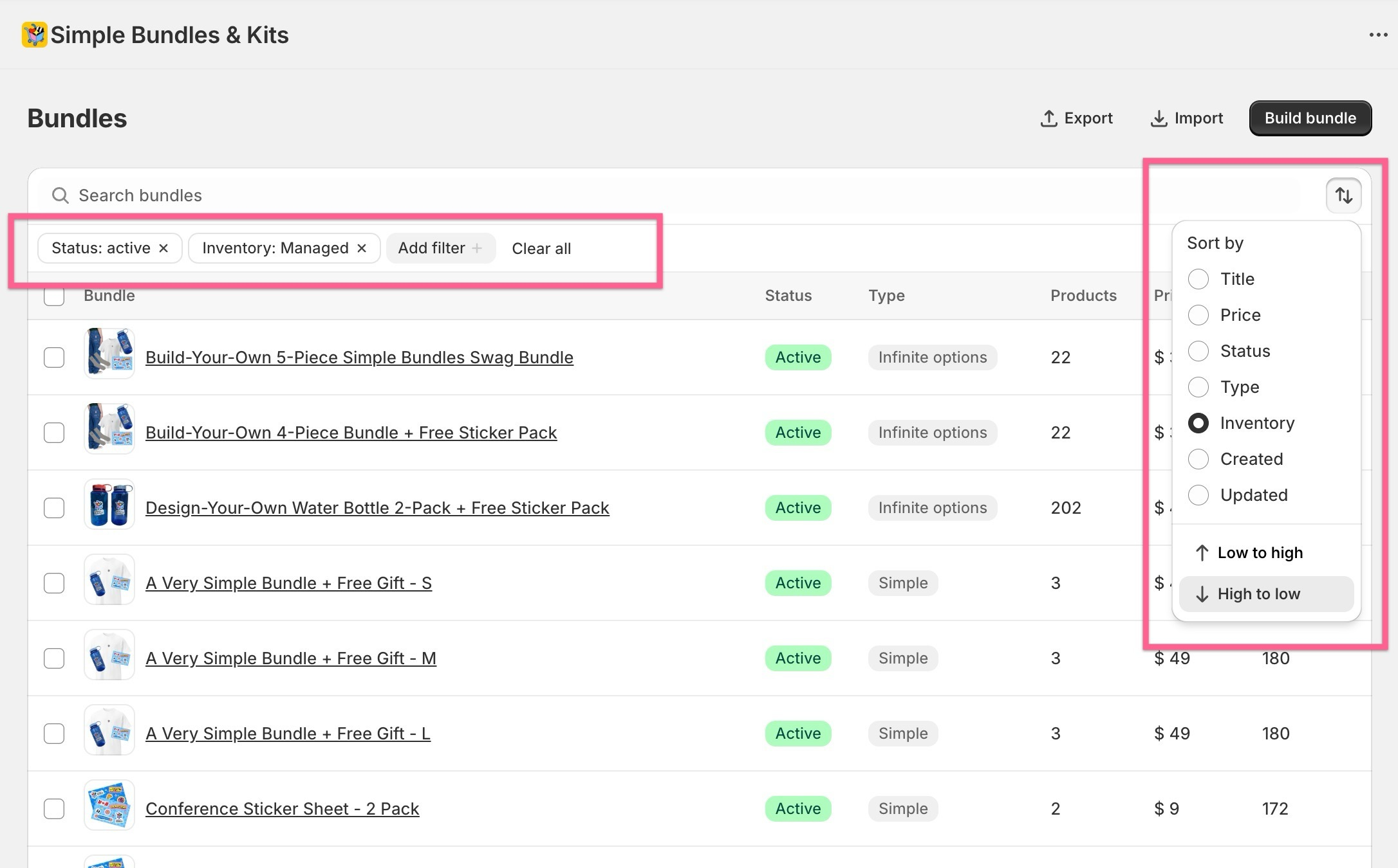 - Filter bundles by status (such as Active or Draft) and by whether inventory is managed