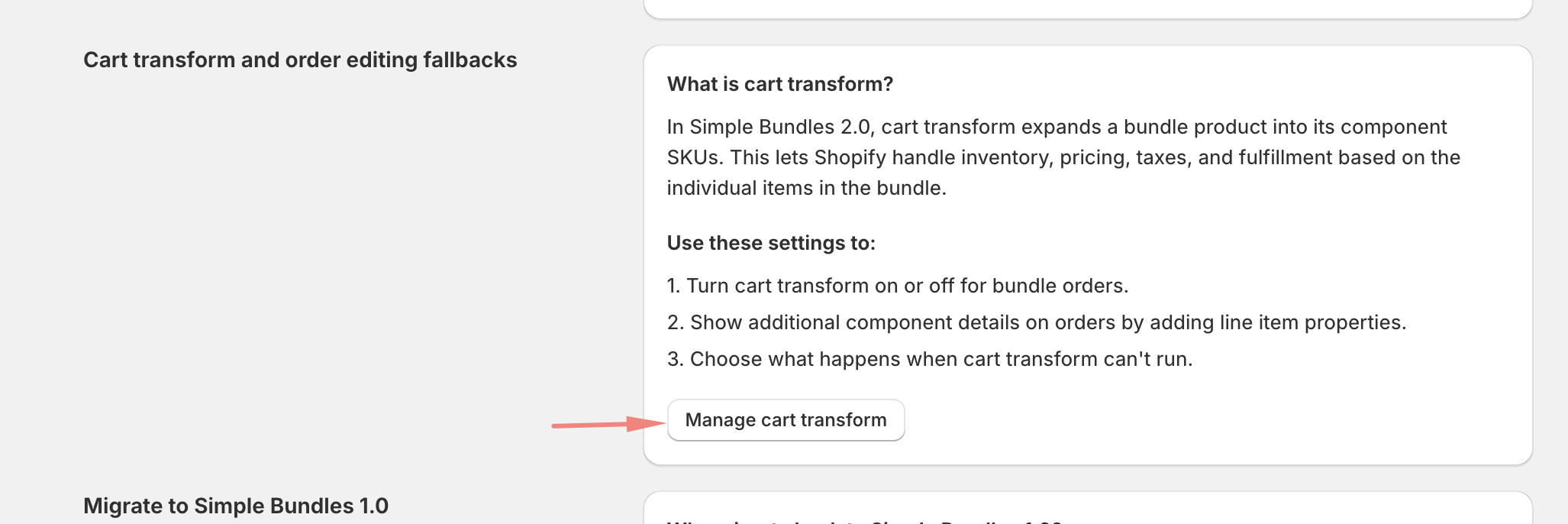 - Click on manage cart transform under Cart Transform and Order editing fallbacks