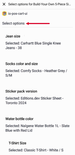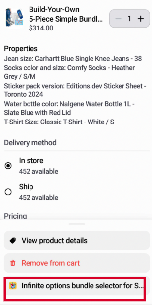 - Once you’ve selected the options, you’ll see the bundle split into individual line items in the cart. To edit your selections, tap the “Infinite Options Bundle Selector” extension, then update the options as needed.