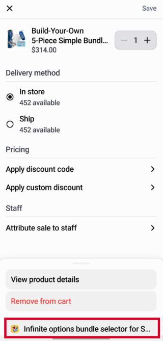 Sales Attribution Compatibility: Currently, Simple Bundles 2.0 is not compatible with Shopify POS when using sales attribution features during checkout. If sales attribution is enabled, you will not be able to select or break down infinite options bundles.