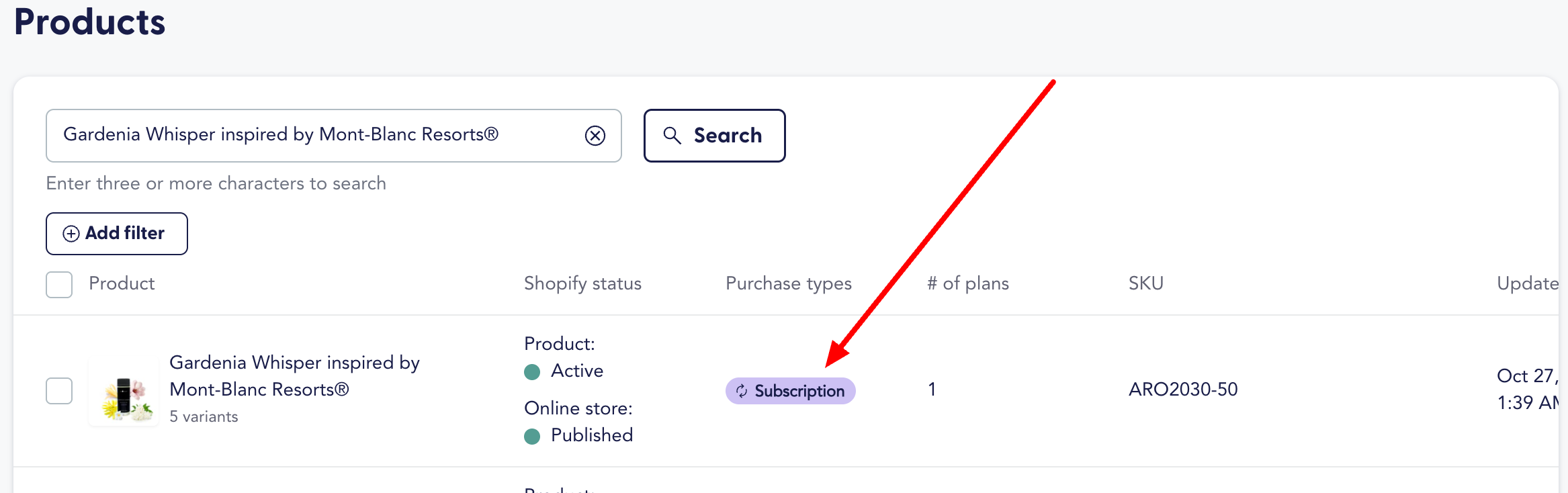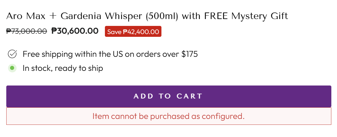 For example:“Aro Home + Gardenia Whisper (150ml) with FREE Mystery Gift”, the product “Gardenia Whisper inspired by Mont-Blanc Resorts®” is configured in Recharge as subscription-only (with the one-time purchase option turned off).