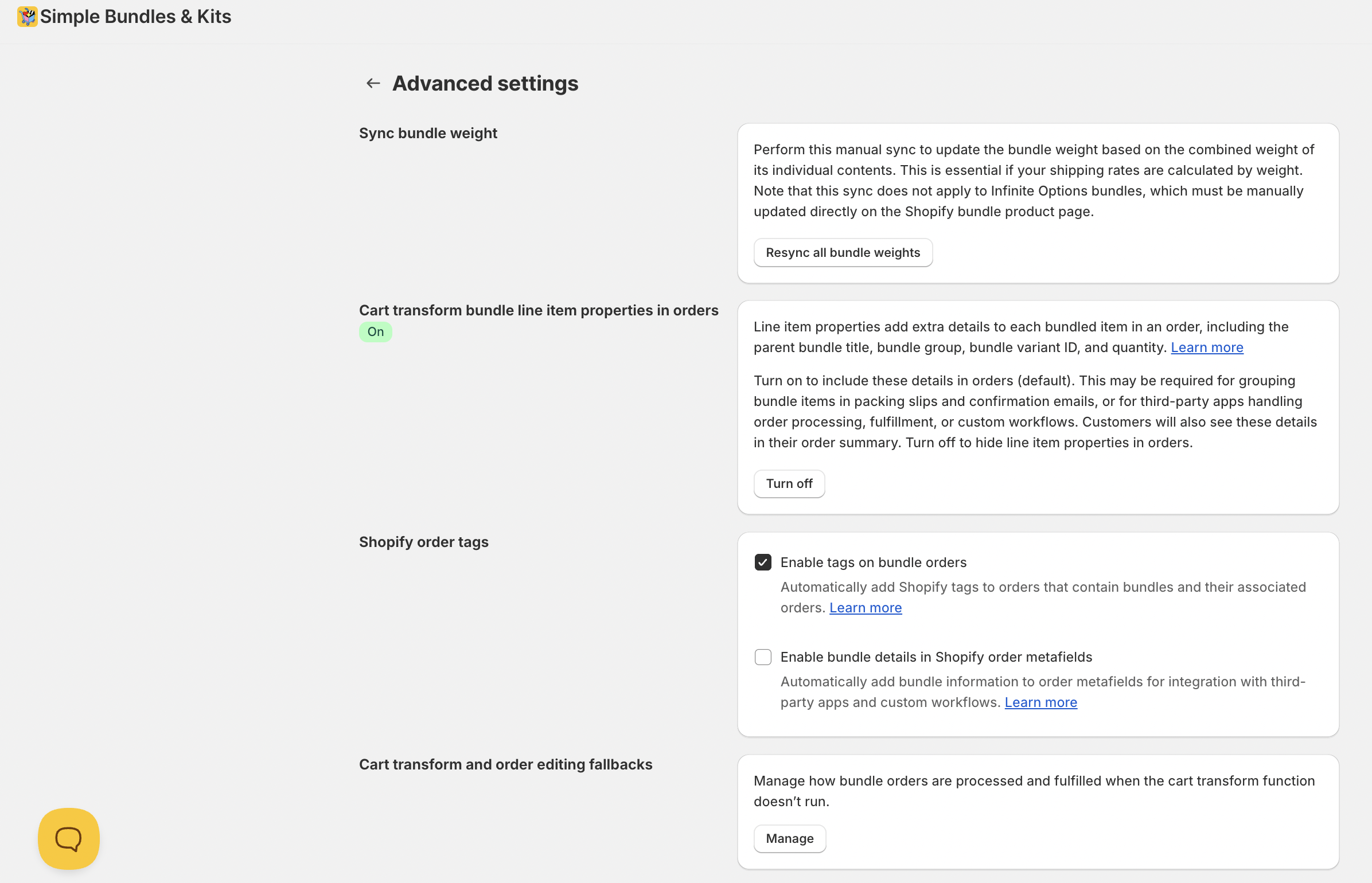 To access these settings, go to Simple Bundles app → Settings → Advanced settings → Manage Advanced settings.