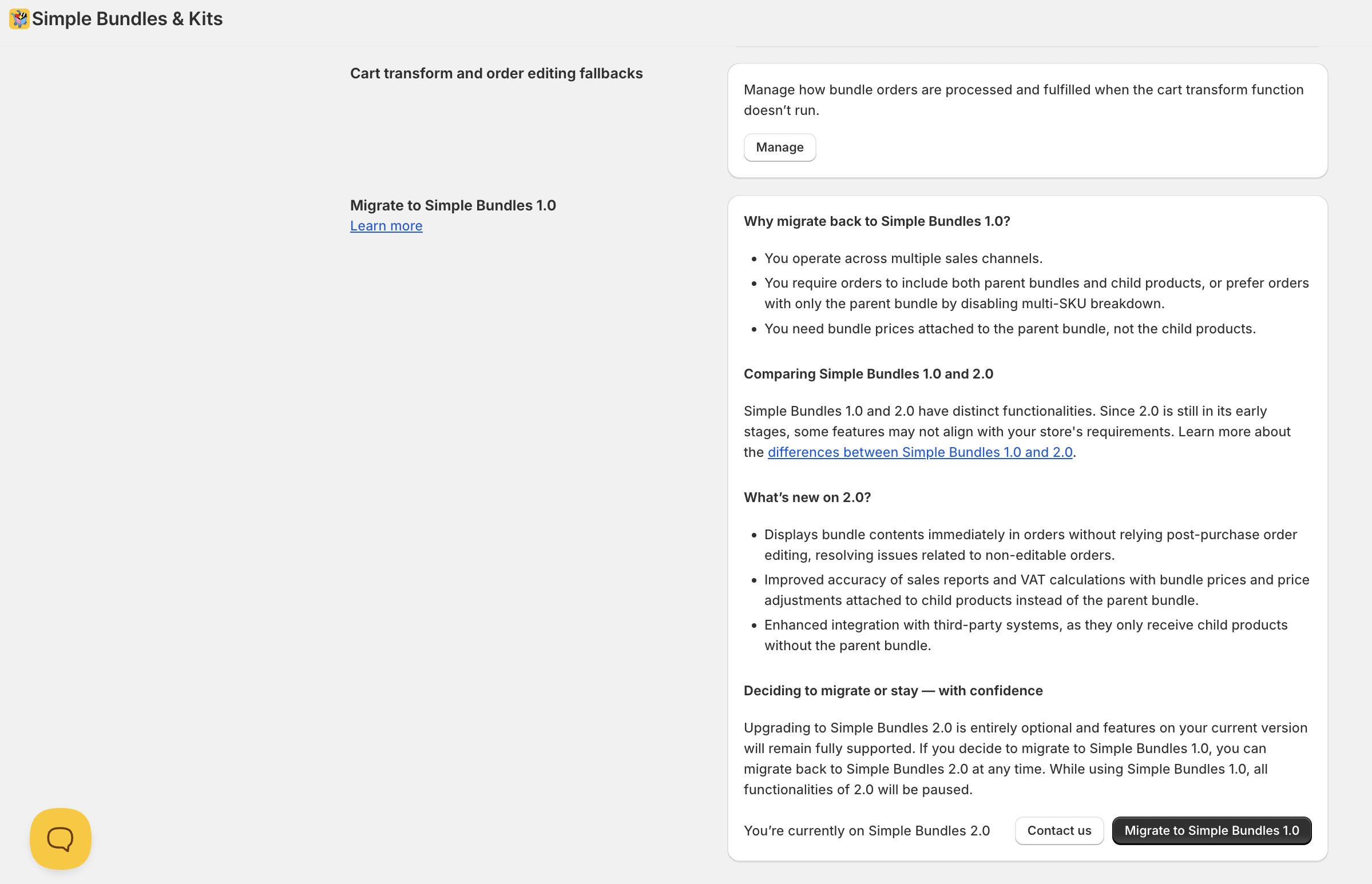 You can manage your Simple Bundles app version using this setting, which allows you to switch between Simple Bundles 1.0 and 2.0