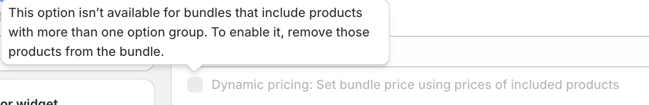 The Dynamic Pricing feature is disabled when your bundle includes products added via the "Add Product with Variants" option, particularly when one or more of the included products offer multiple dropdowns, such as size, color, or style.