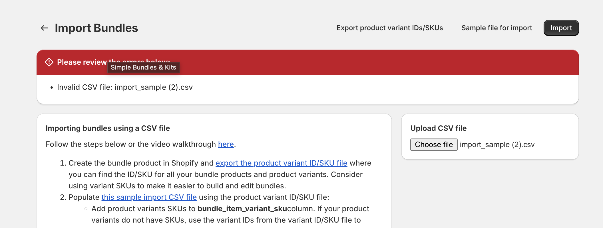 This FAQ covers the most common questions and issues merchants run into when importing bundles using a CSV file in Simple Bundles. Whether you're seeing an error message, wondering which columns are required, or trying to fix formatting quirks, this guide will help you get your import running smoothly again.