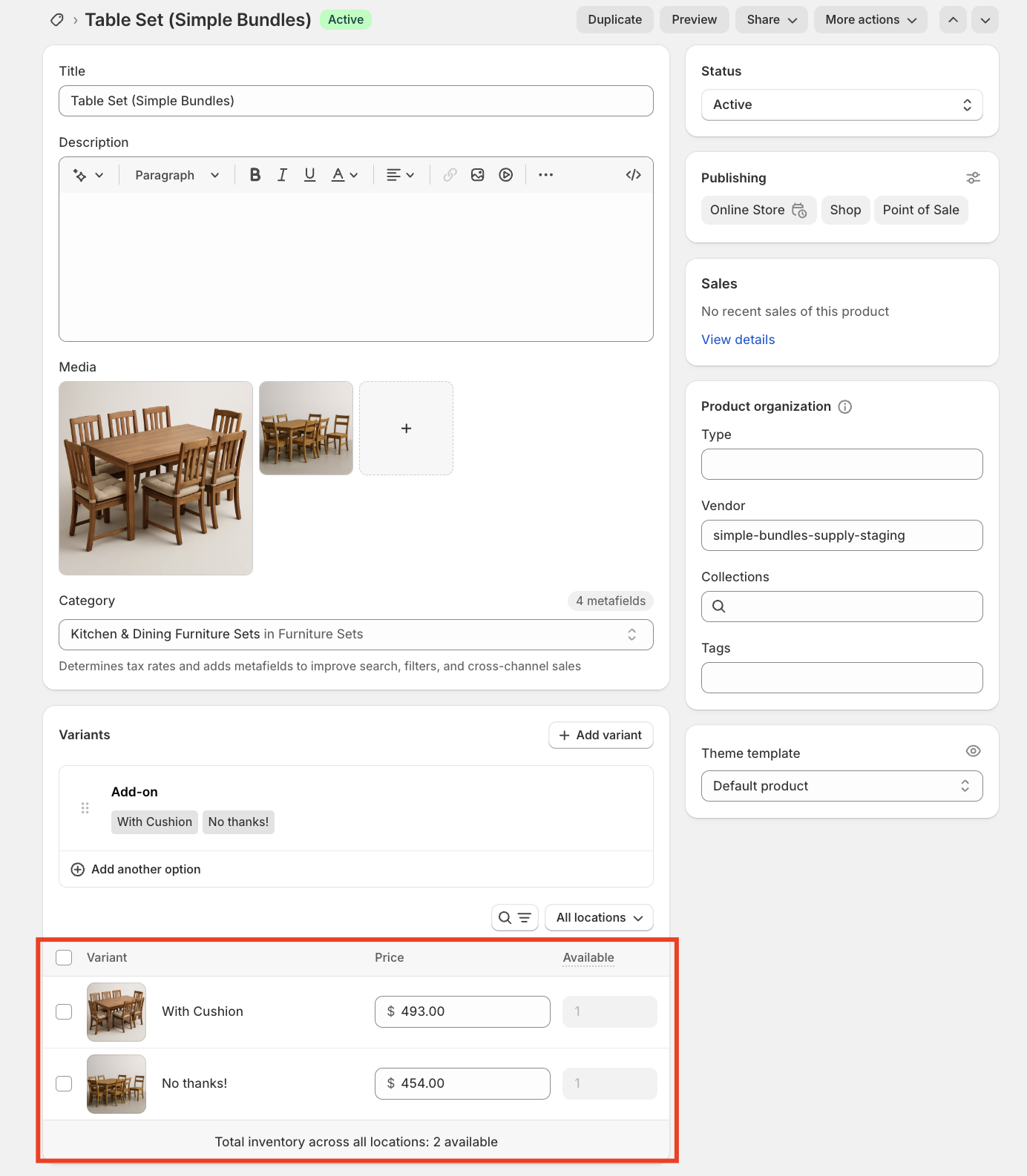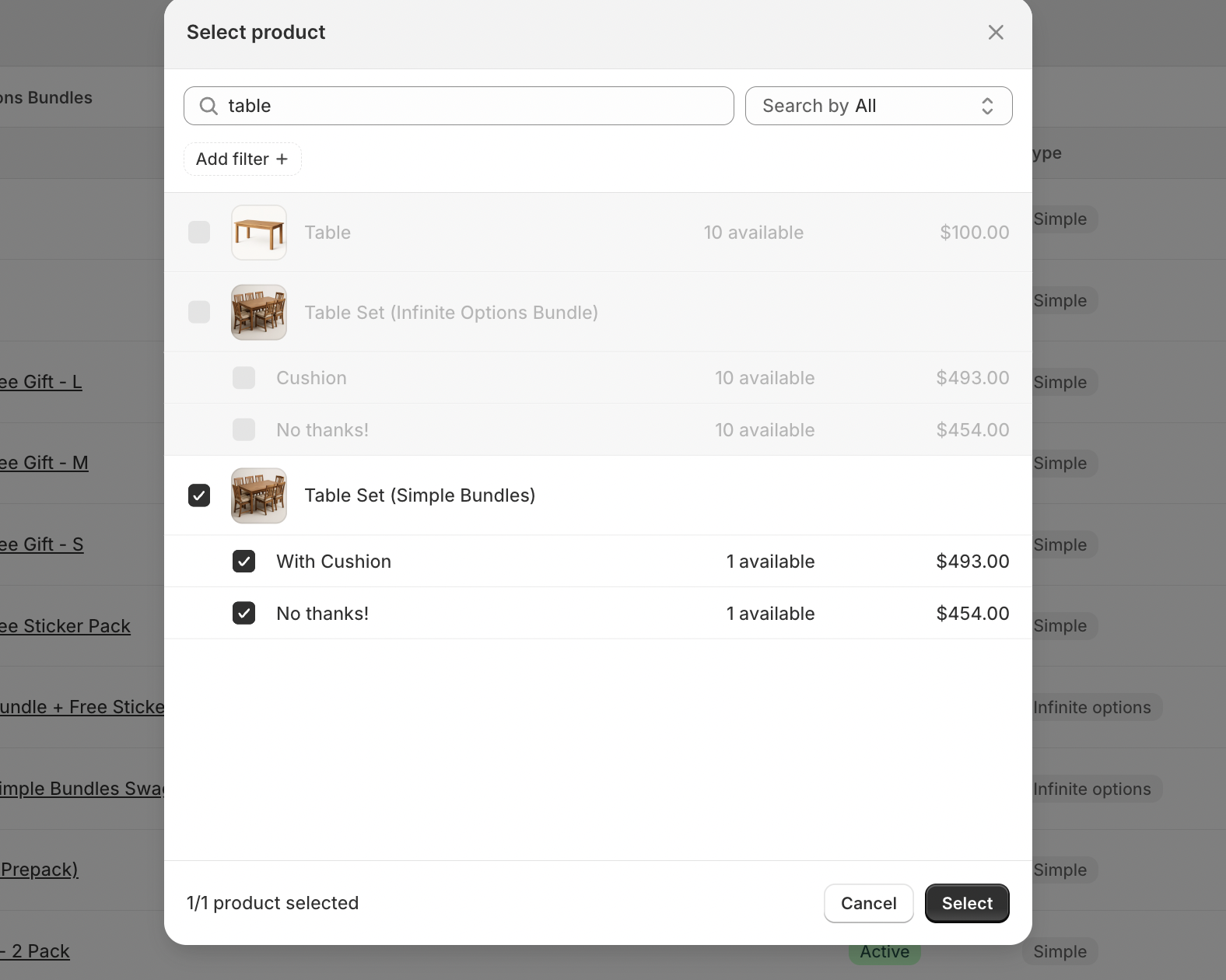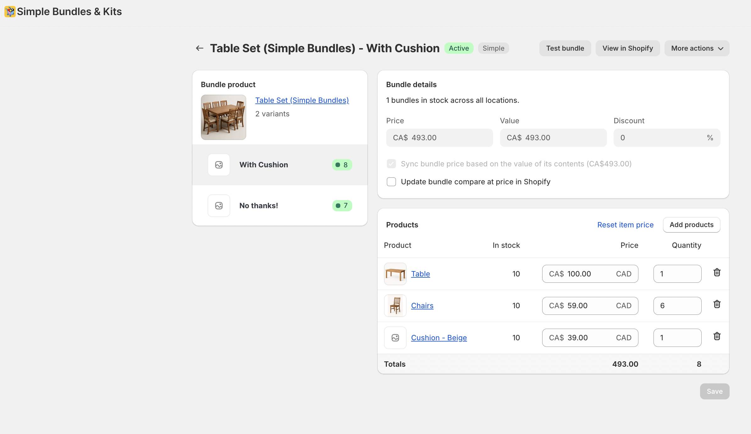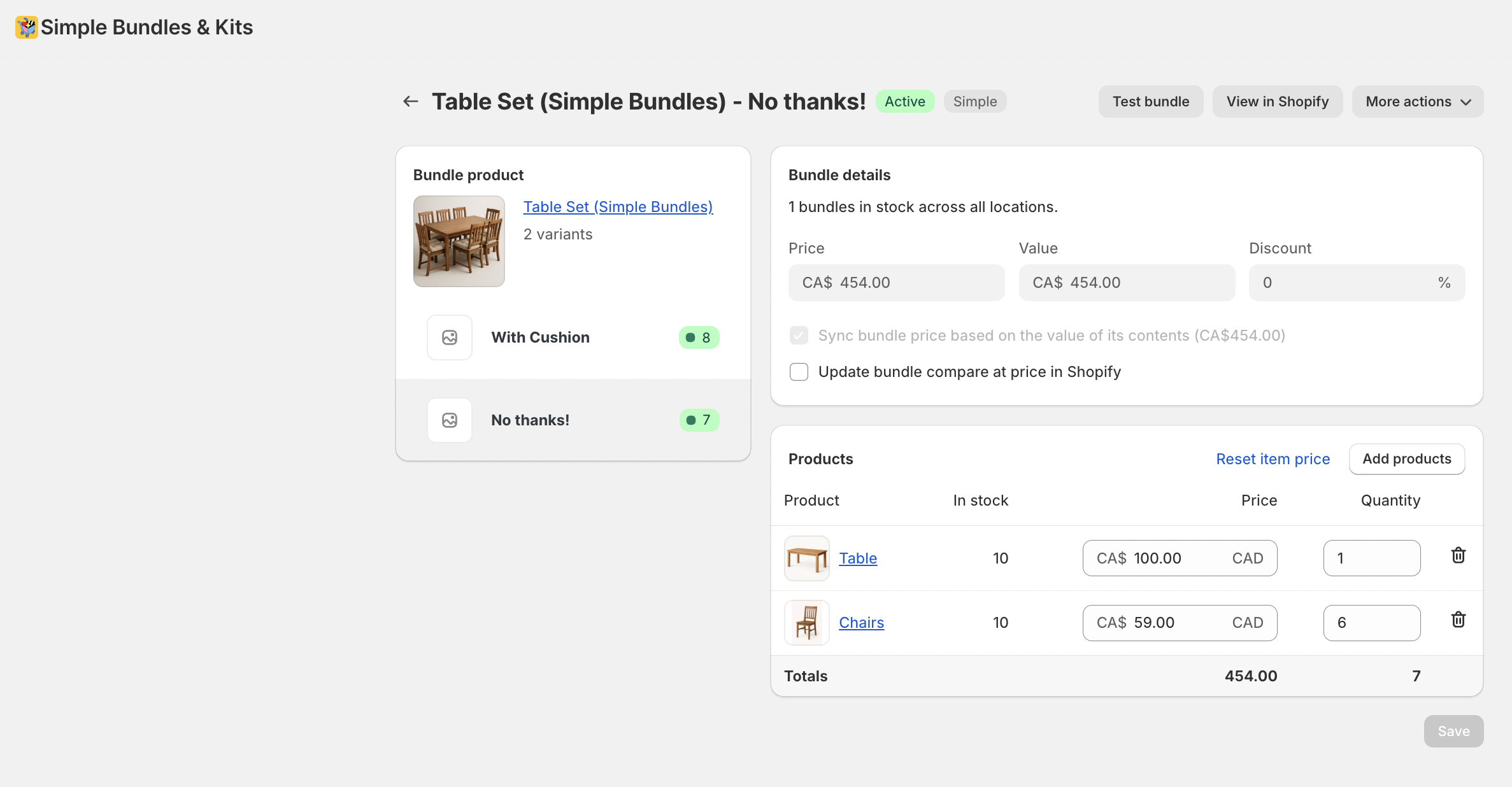 For this example, we’ll use a Table Set that includes a table and six chairs, with an optional add-on for seat cushions. Because this is a fixed bundle, customers can choose whether or not they want to include the cushions.
