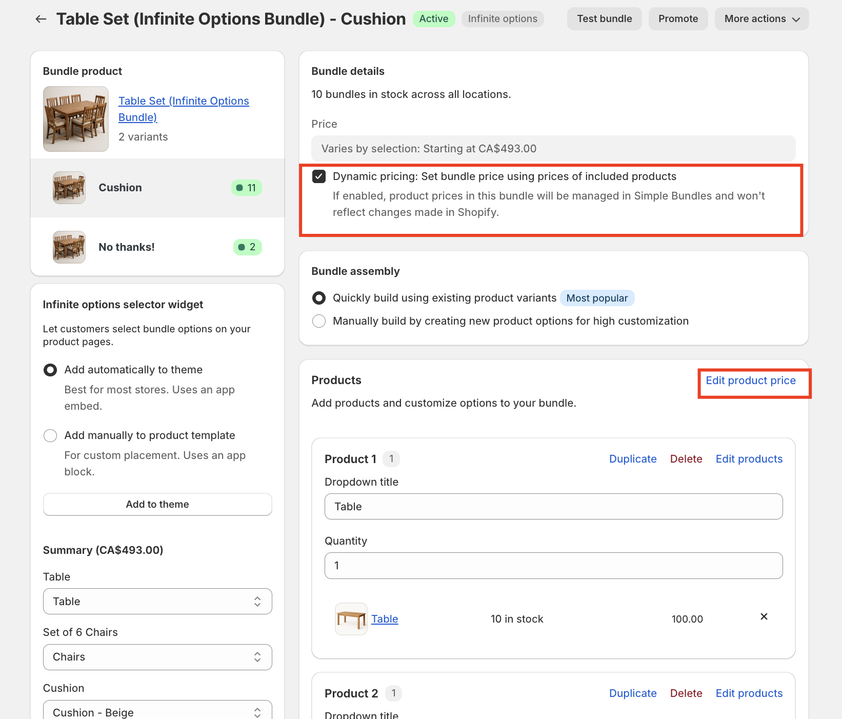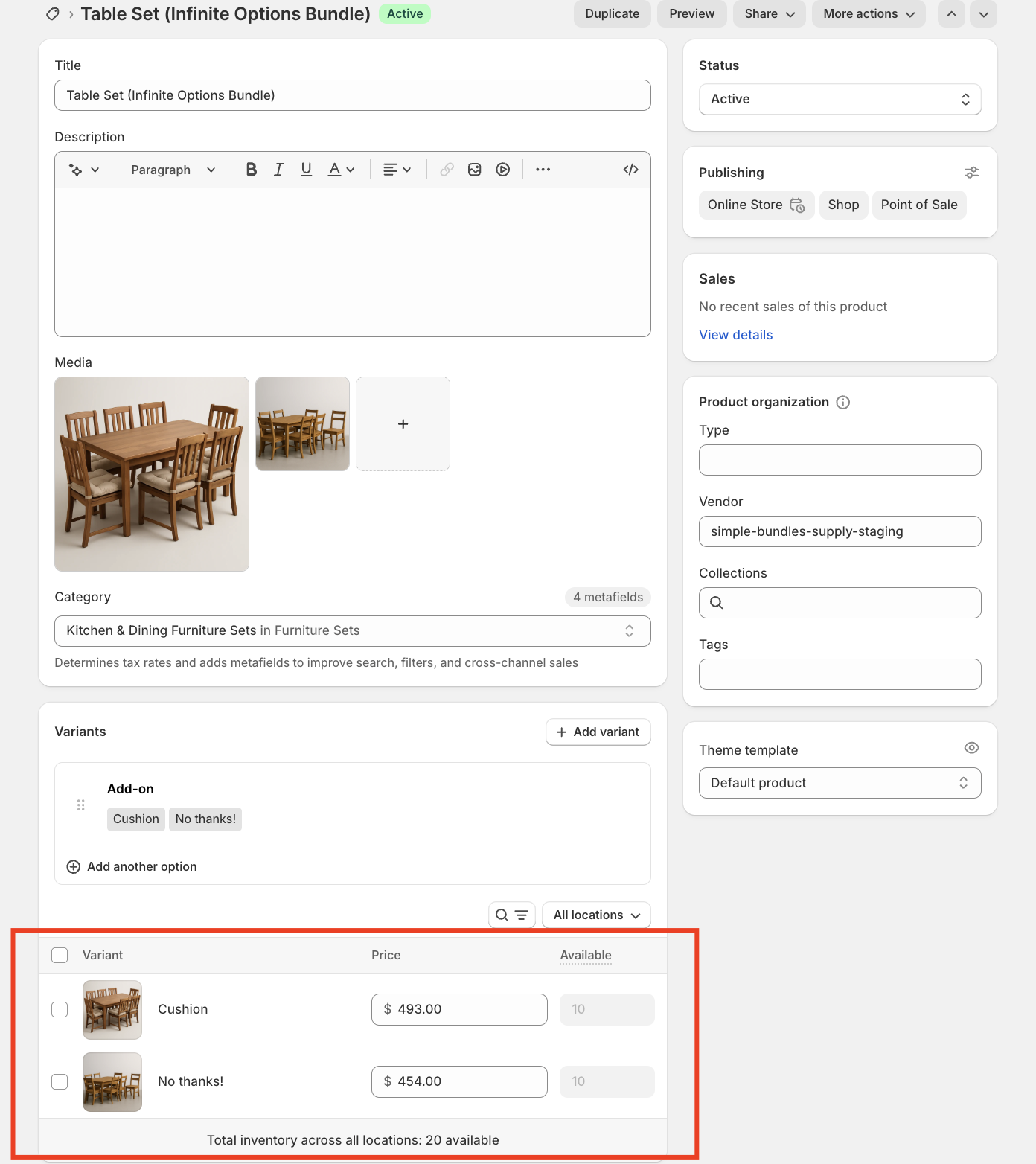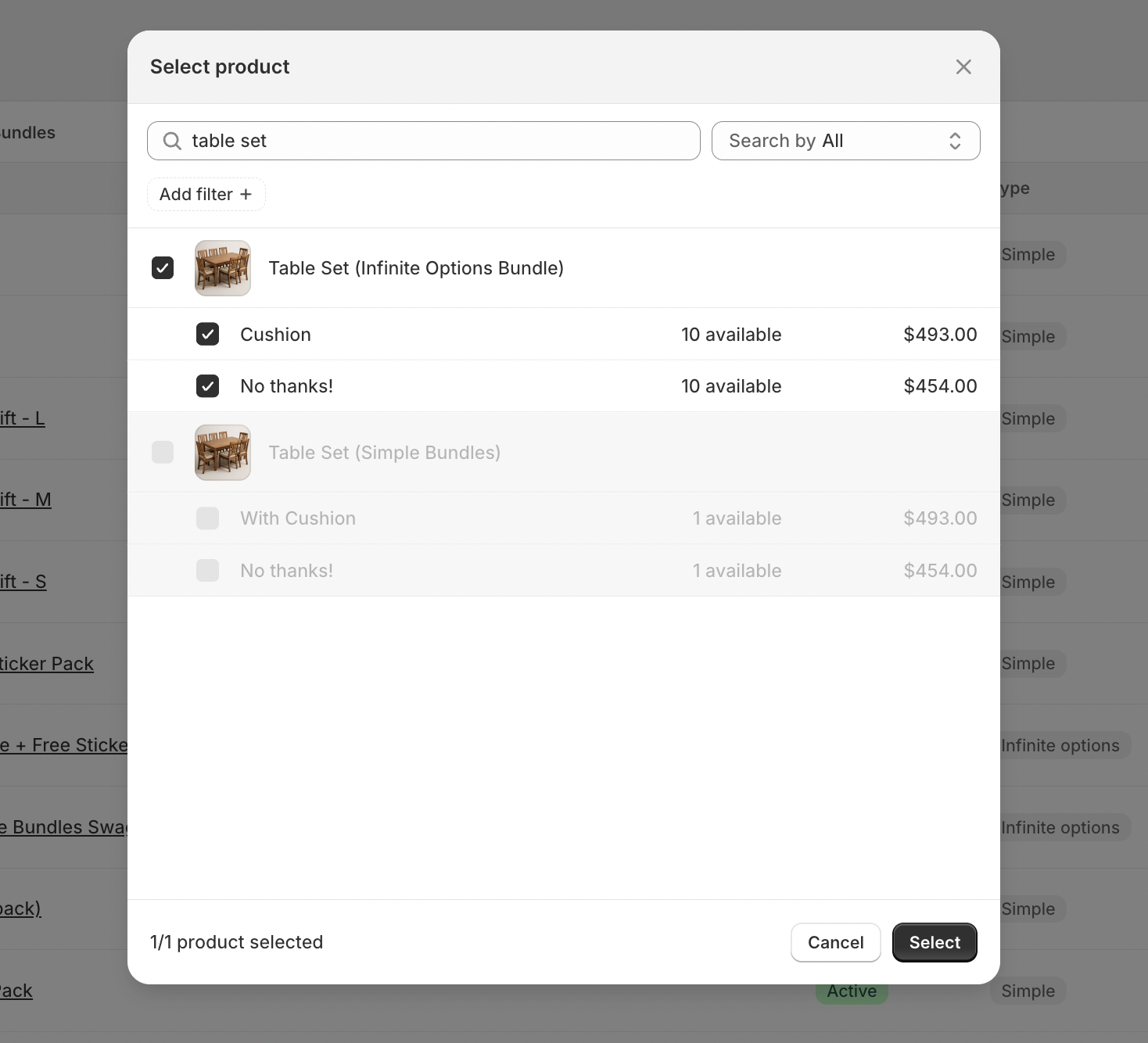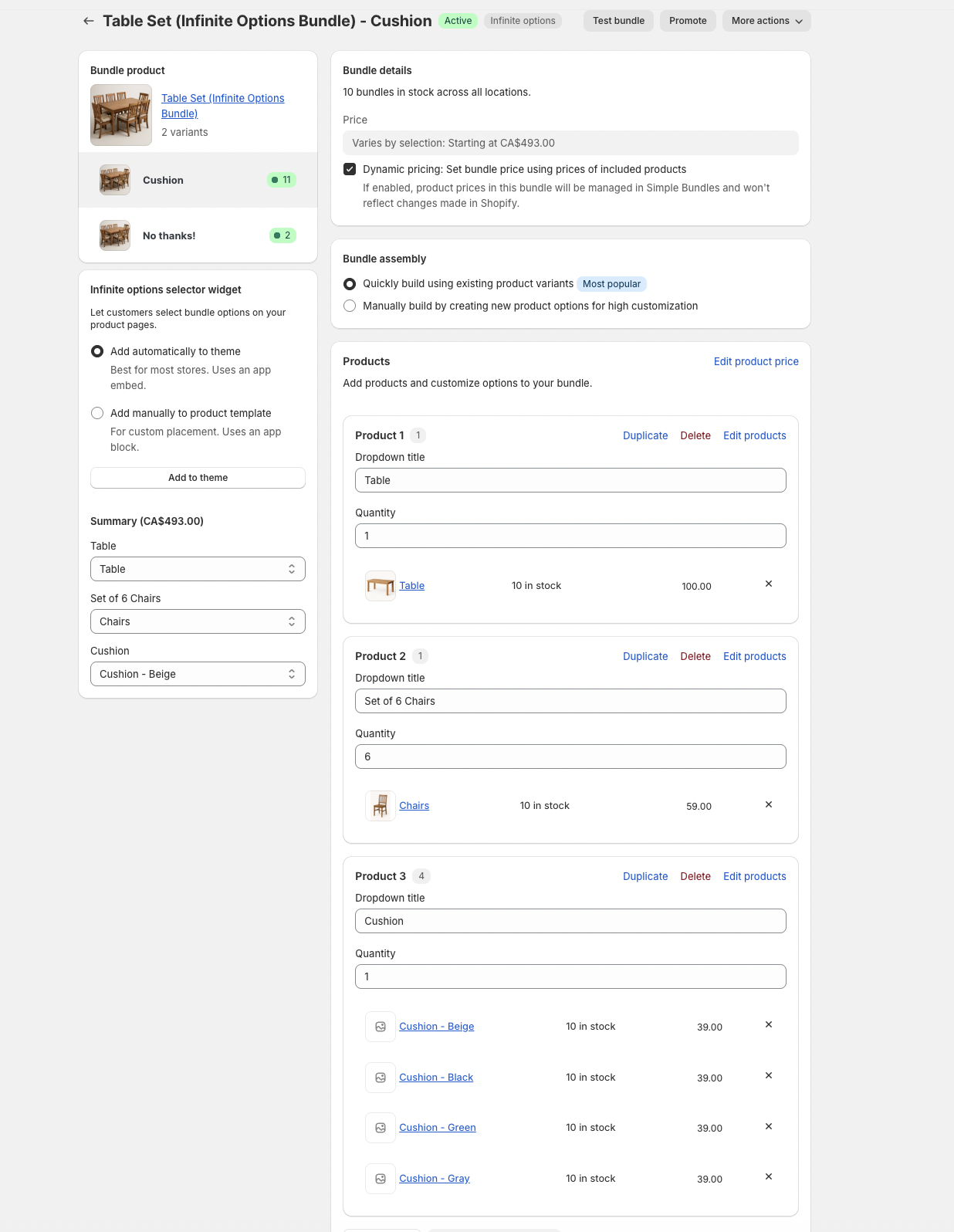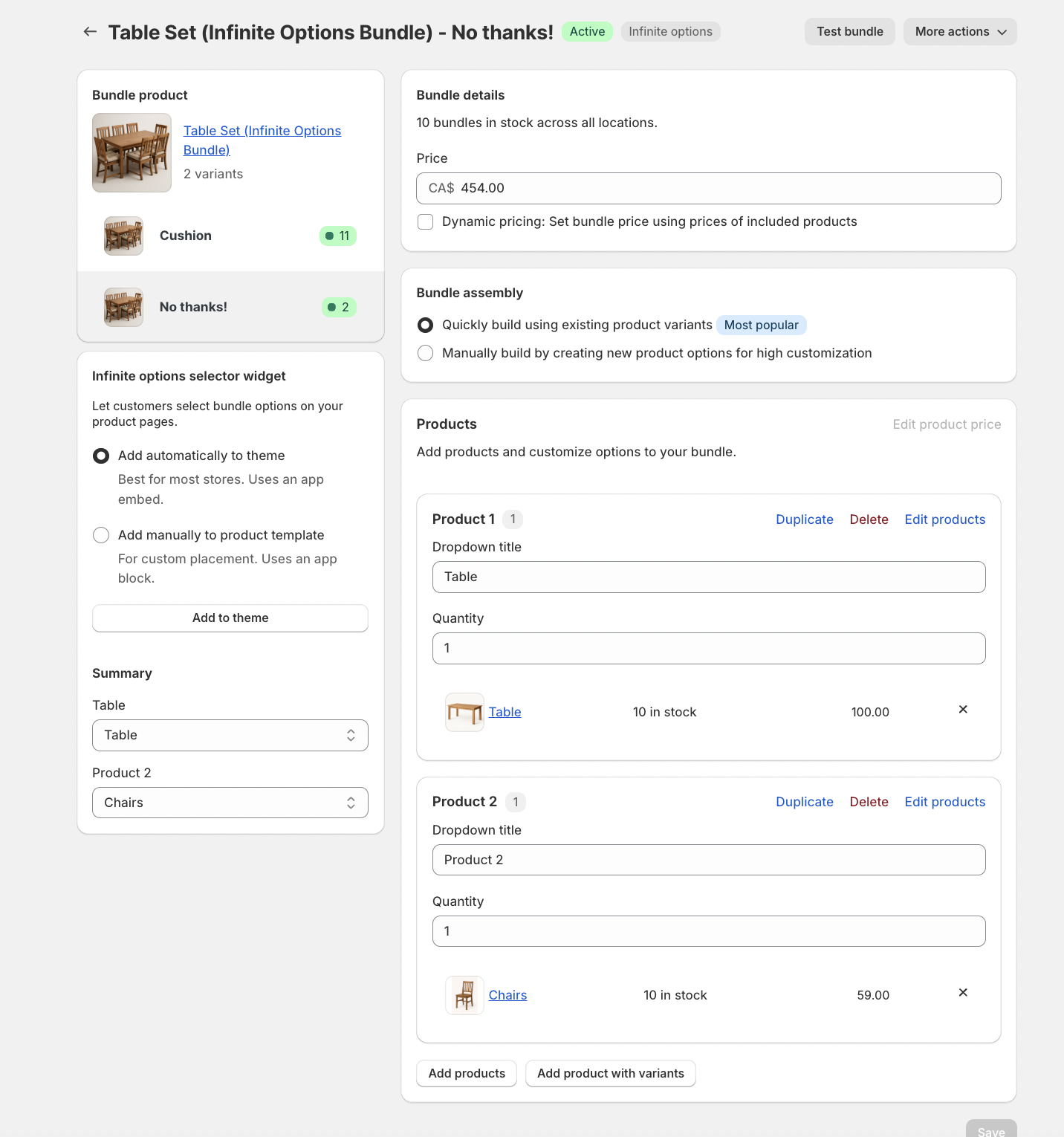 For this example, we’ll use a Table Set that includes a table and six chairs, with an optional add-on for seat cushions. Because this is a fixed bundle, customers can choose whether or not they want to include the cushions.