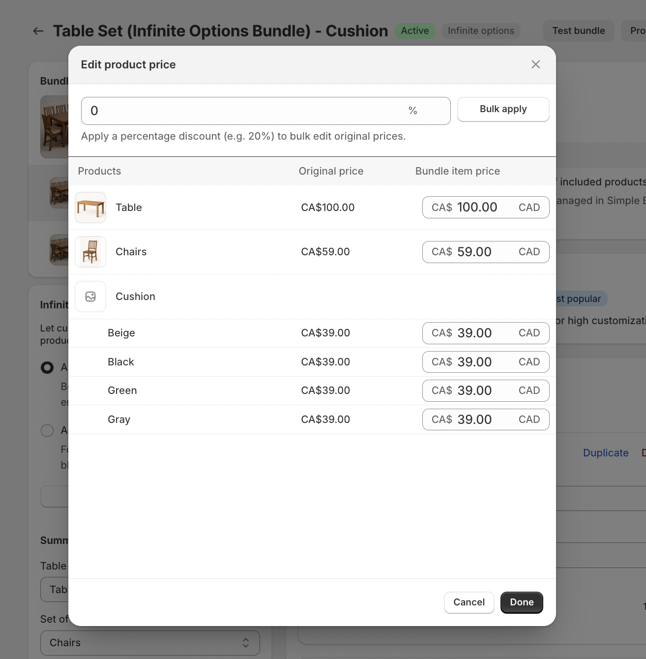 With this bundle type, you can still create a Table Set with a cushion add-on, but also allow customers to choose additional details, such as the color of the cushions they’d like to add.