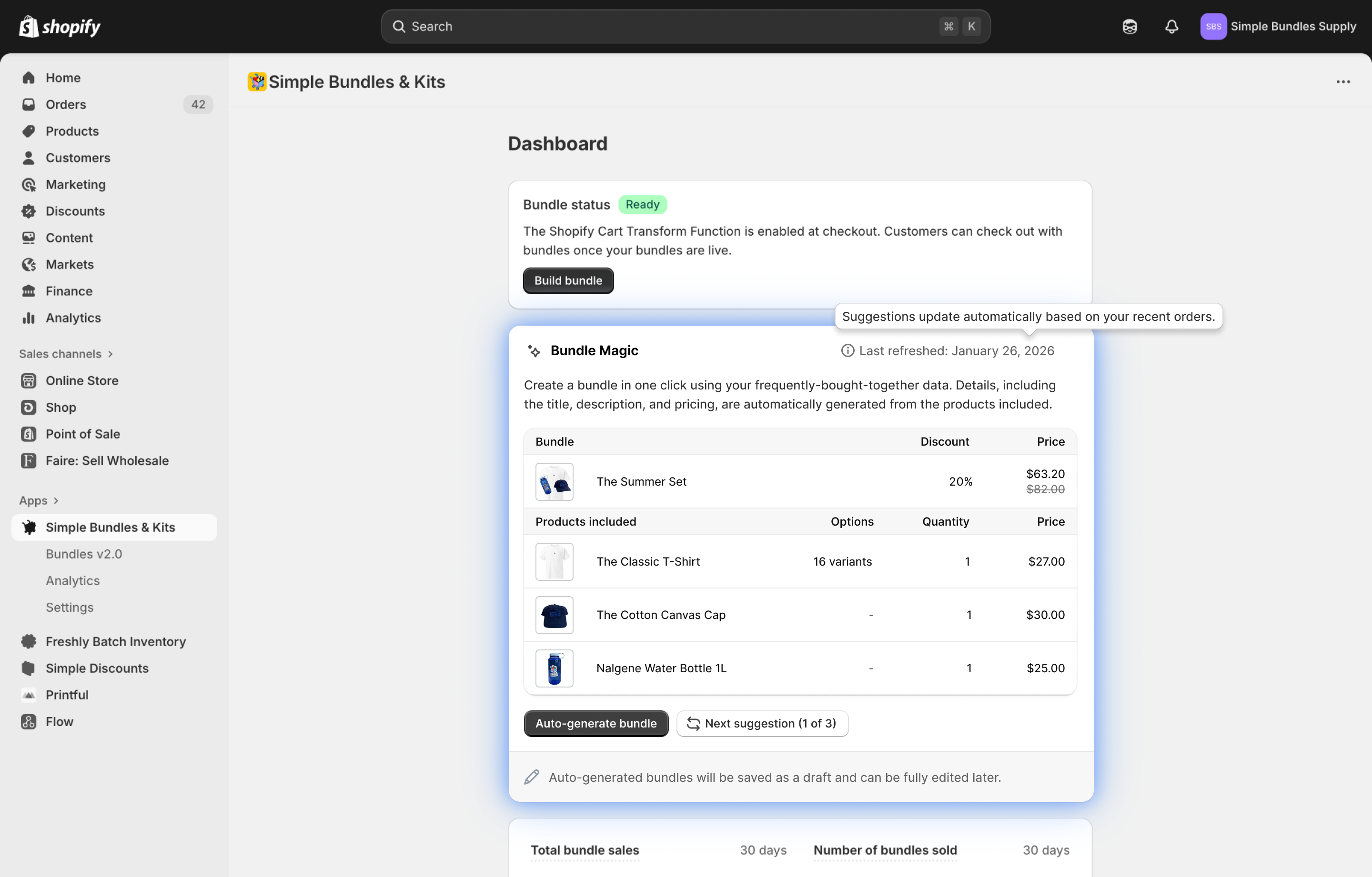 You’ll see the Bundle Magic card on your Dashboard as soon as you install Simple Bundles. Bundle Magic is designed to help you launch bundles faster than ever using data you already have.