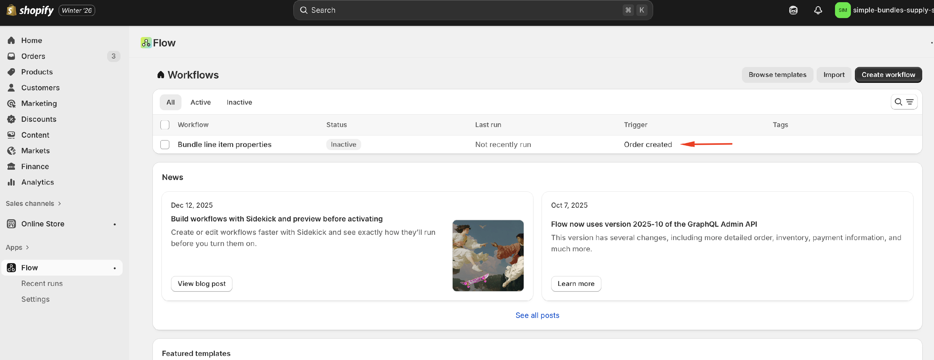 Each time a new order is created, this Shopify Flow checks whether the order contains bundle items created with Simple Bundles 2.0. If a parent bundle includes custom cart attributes, such as a gift note or special instructions, the Flow collects those values. The attributes are grouped by bundle and then appended to the order notes.