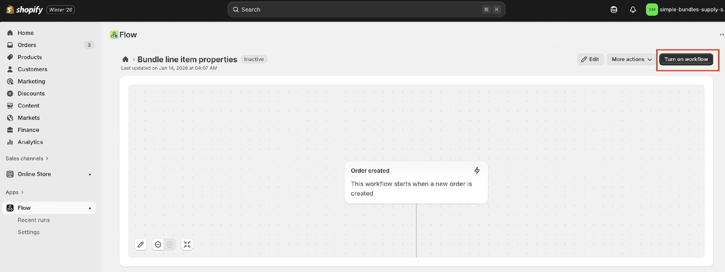 - Once the Flow is imported, open the workflow. You’ll see that it is triggered when an order is created. The main action in the workflow updates the order note using a Liquid template.