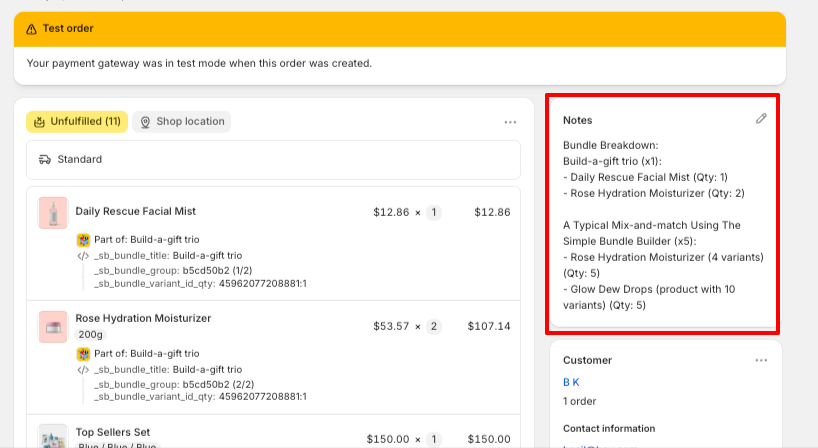 The result is a clean and easy-to-read summary of bundle-specific instructions directly within the order notes, making fulfillment and review more efficient.