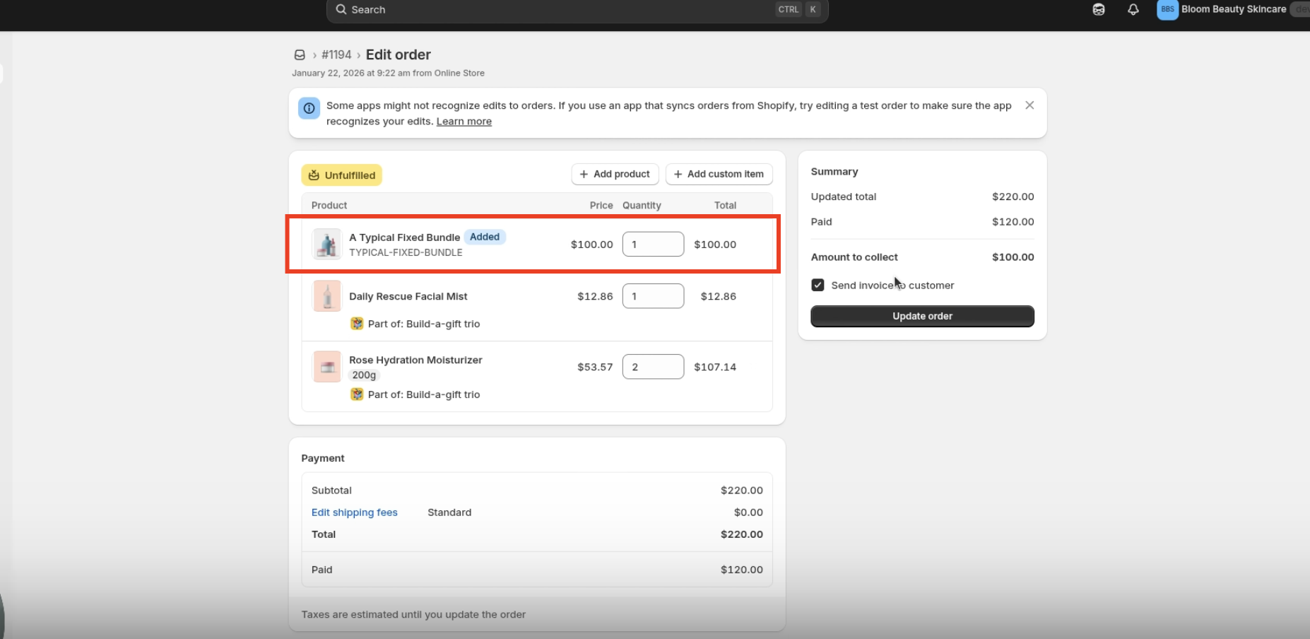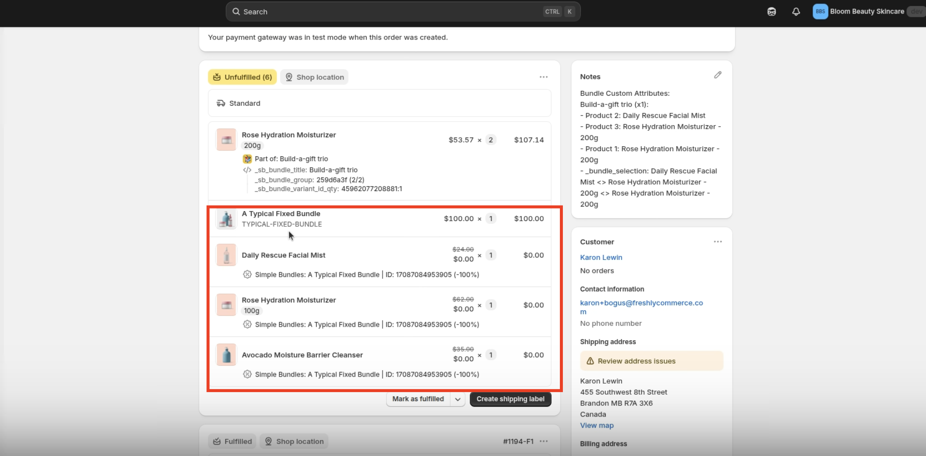 - You can test this workflow using an order that has already passed Shopify’s 1-hour order editing window. In the example below, the order was edited to include an additional bundle product. However, since the order had already passed Shopify’s 1-hour editing window, the bundle was no longer automatically broken down.
