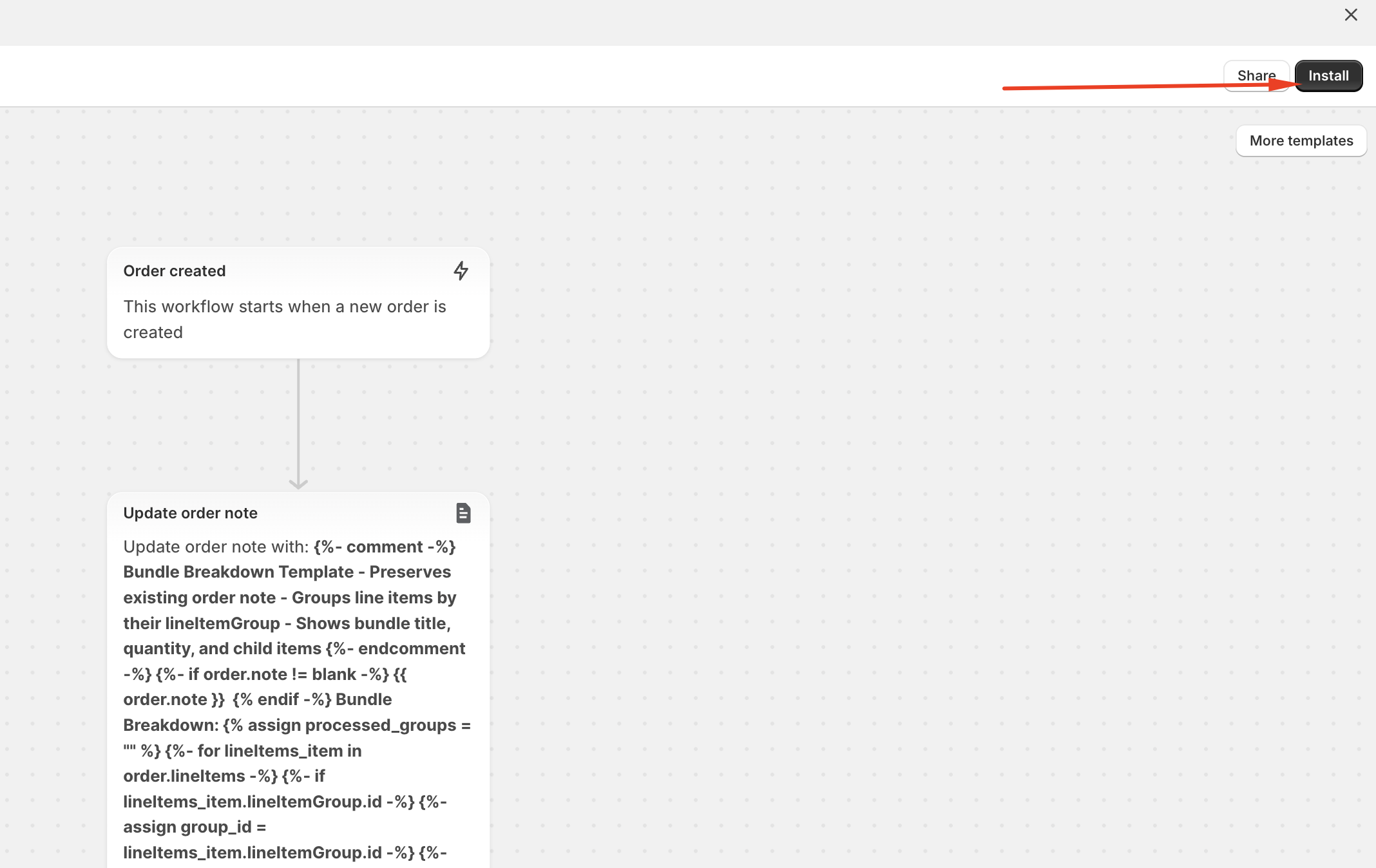 - Once installed, open the template. You’ll see that it is triggered when an order is created.