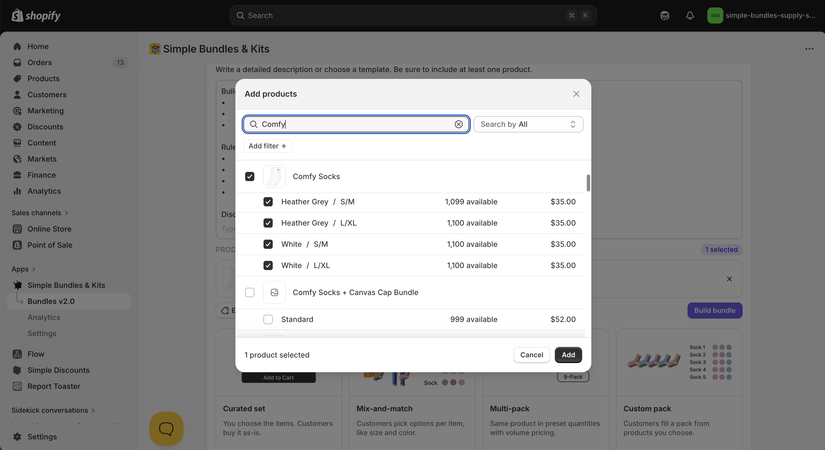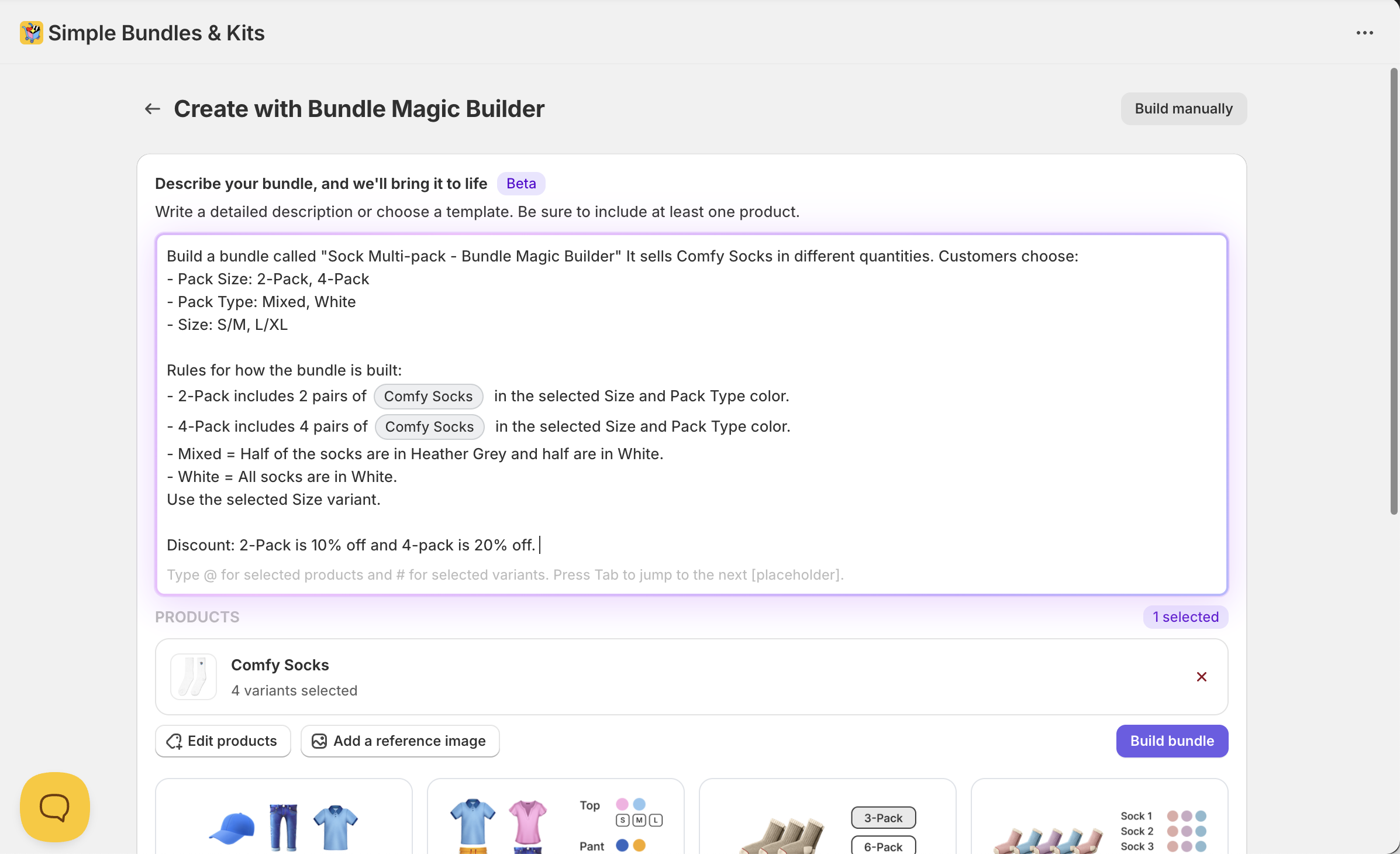 Build a bundle called "Sock Multi-pack - Bundle Magic Builder" It sells Comfy Socks in different quantities. Customers choose: - Pack Size: 2-Pack, 4-Pack - Pack Type: Mixed, White - Size: S/M, L/XL Rules for how the bundle is built: - 2-Pack includes 2 pairs of Comfy Socks in the selected Size and Pack Type color. - 4-Pack includes 4 pairs of Comfy Socks in the selected Size and Pack Type color. - Mixed = Half of the socks are in Heather Grey and half are in White. - White = All socks are in White. Use the selected Size variant. Discount: 2-Pack is 10% off and 4-pack is 20% off.