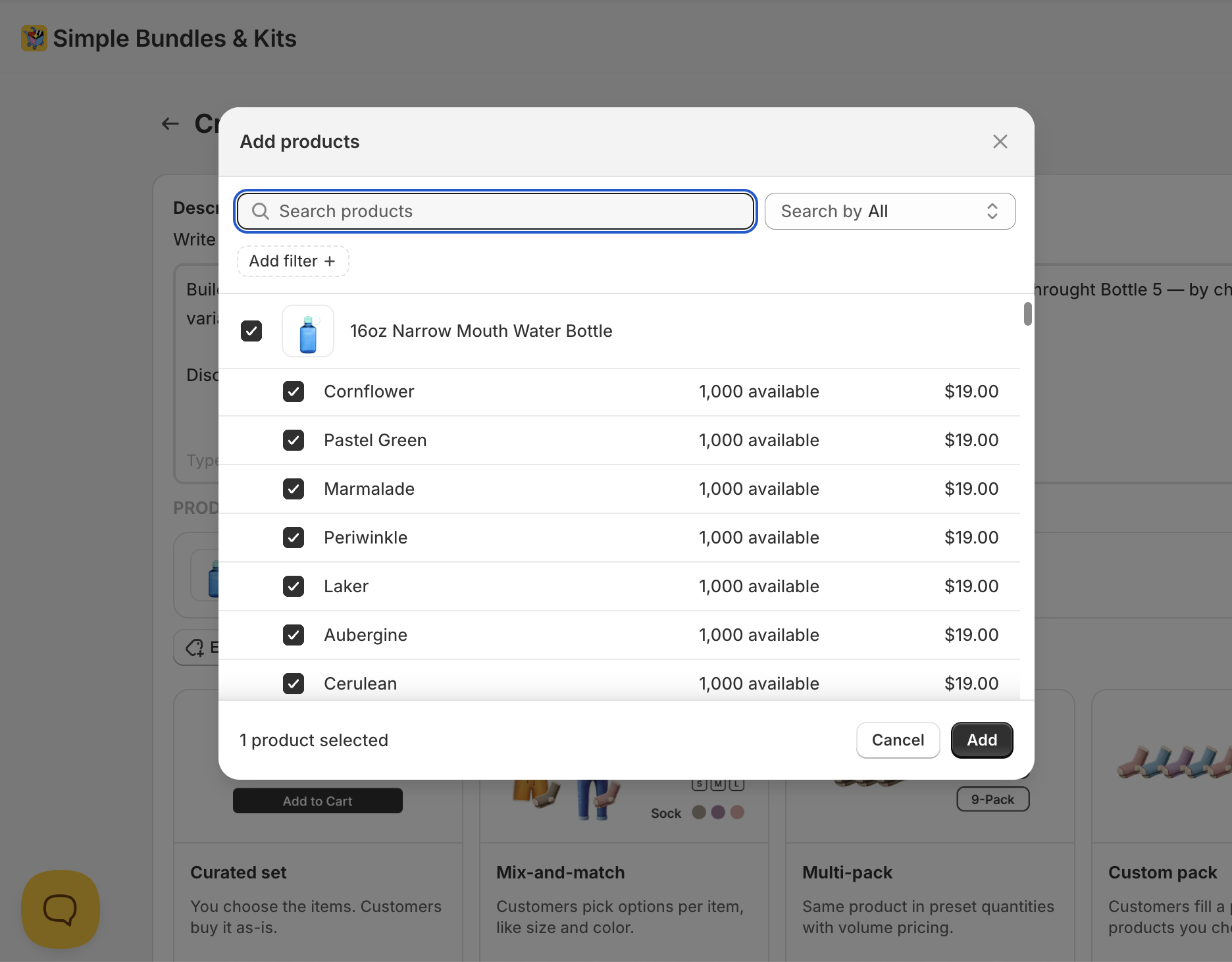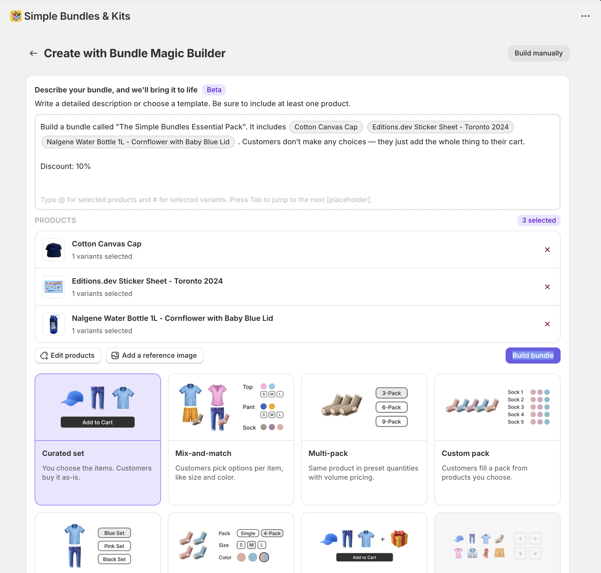 Build a bundle called "The Simple Bundles Essential Pack". It includes Cotton Canvas Cap Editions.dev Sticker Sheet - Toronto 2024 Nalgene Water Bottle 1L - Cornflower with Baby Blue Lid . Customers don’t make any choices — they just add the whole thing to their cart. Discount: 10%