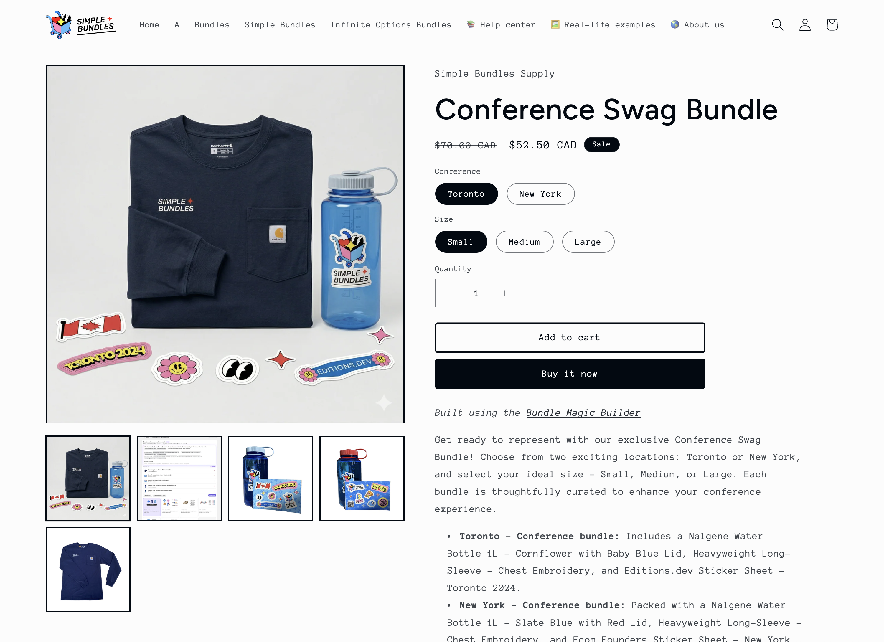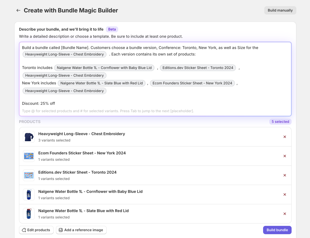 Build a bundle called [Bundle Name]. Customers choose a bundle version, Conference: Toronto, New York, as well as Size for the Heavyweight Long-Sleeve - Chest Embroidery . Each version contains its own set of products: Toronto includes Nalgene Water Bottle 1L - Cornflower with Baby Blue Lid , Editions.dev Sticker Sheet - Toronto 2024 , Heavyweight Long-Sleeve - Chest Embroidery New York includes Nalgene Water Bottle 1L - Slate Blue with Red Lid , Ecom Founders Sticker Sheet - New York 2024 , Heavyweight Long-Sleeve - Chest Embroidery Discount: 25% off