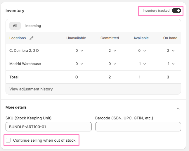 Ensure that Track quantity is enabled on your bundle variant in Shopify. To avoid negative inventory, we also recommend unchecking the "Continue selling when out of stock" option.