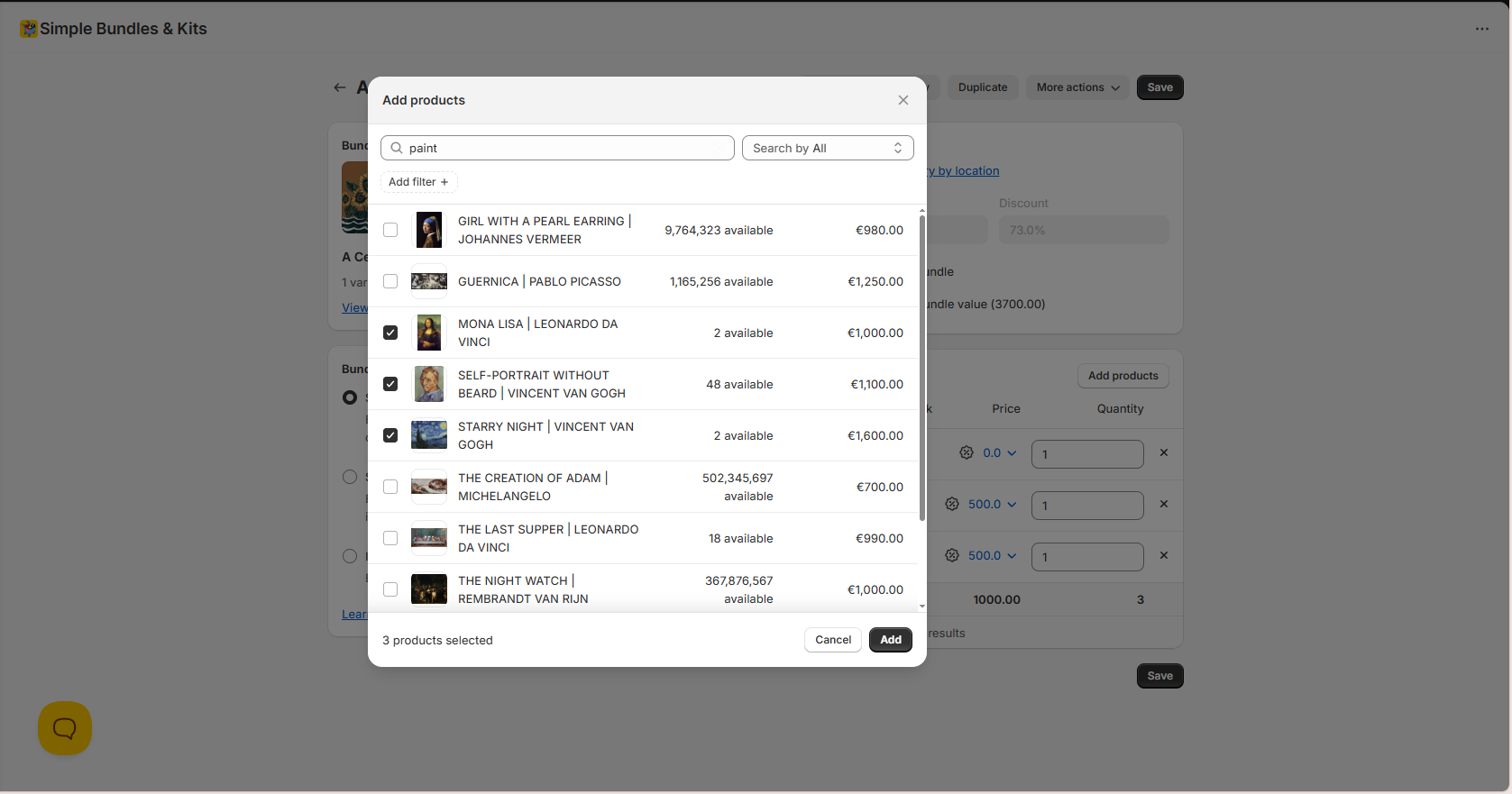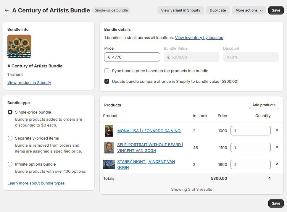 - Adjust the quantity of each of the individual SKUs and the price of the bundle.